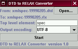 DTD2RELAX_1_1_1-src.zip [50KB] DTD2RELAX_1_1_1-bin.jar [25KB] DTD2RELAX_1_1_1-bin-XML4J.jar [250KB] |